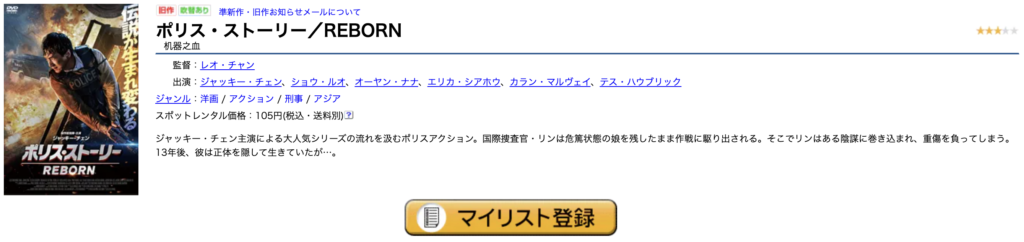 無料期間中は、8枚まで無料レンタルでき、『ポリス・ストーリー REBORN』もDVDレンタルで無料視聴可能です。