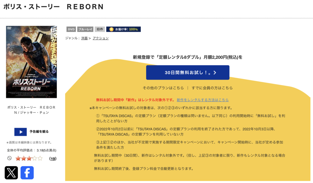 無料期間中は旧作DVDを最大8枚まで無料レンタル可能で、『ポリス・ストーリー REBORN』も対象作品です。