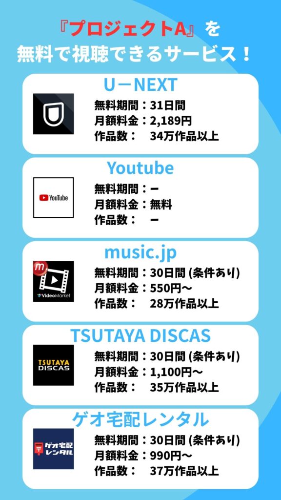 以下は『プロジェクトA』を無料で見られるサービスです。