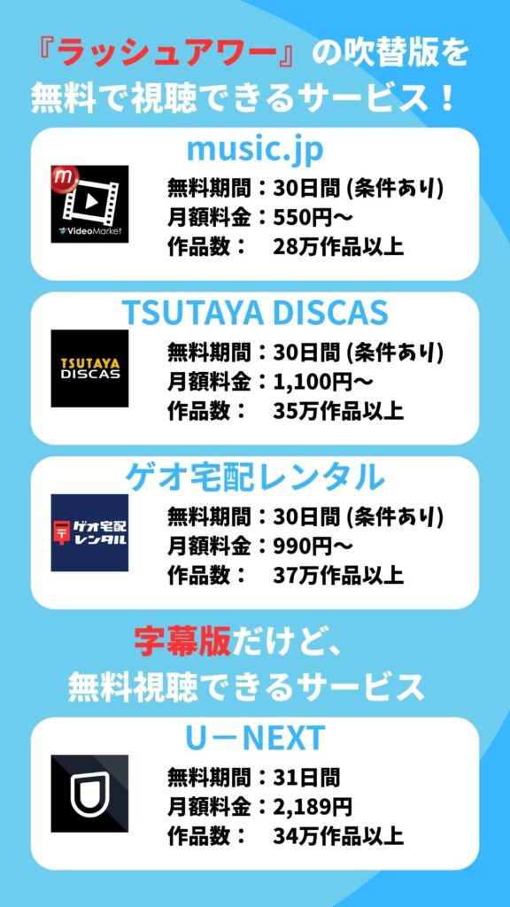 『ラッシュアワー』は、動画配信サービスごとに吹替対応の有無や見放題・レンタルの扱いが異なります。