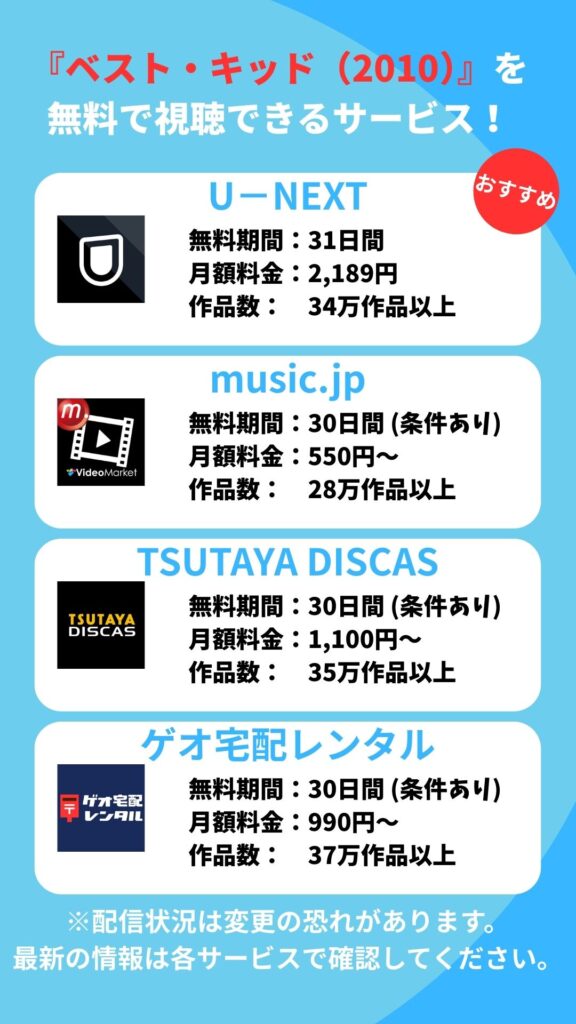 そこでこの記事では、『ベスト・キッド(2010)』を無料で視聴する方法と、主要な動画配信サービス9社の配信状況をまとめてわかりやすく解説します。